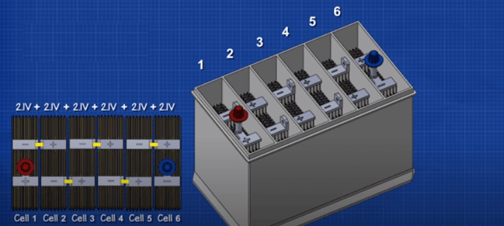 Mỗi ắc quy ô tô thường có 6 ngăn (còn gọi là Cell), mỗi cell chứa một cặp điện cực dương và âm, tạo ra điện áp 2V. Các cell được kết nối nối tiếp, cực âm của ngăn này được kết nối với cực dương của ngăn tiếp theo, để cung cấp cho chúng ta tổng điện áp khoảng 12V.