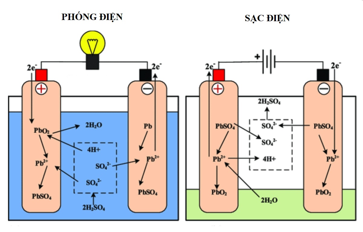 Khi ắc quy cung cấp điện cho động cơ khởi động hoặc các thiết bị điện, phản ứng hóa học xảy ra giữa điện cực và dung dịch axit sulfuric.